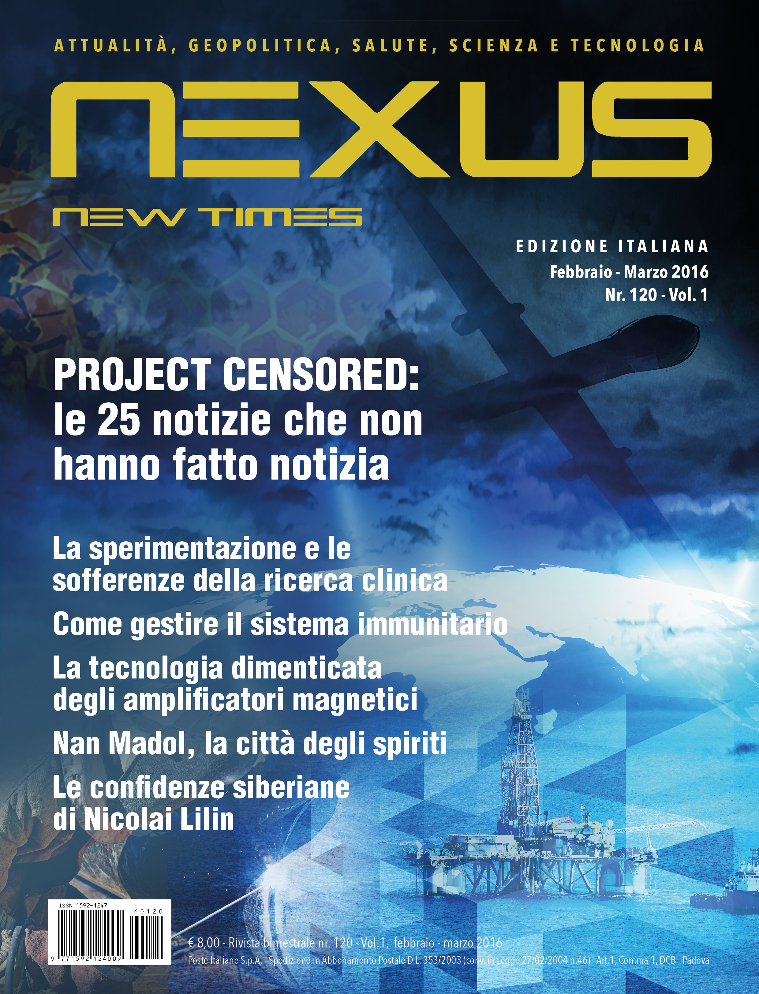 in Villaggio Globale: i pericoli per la salute e per l’ambiente della tecnologia del fracking, l’ecocidio della Monsanto, gli interessi coloniali francesi. Tra gli articoli: Le notizie più censurate del 2015, Esperimenti e tormenti della ricerca clinica, Come trattare il sistema immunitario. La seconda parte dell’articolo I solidi sacri nel nucleo atomico. La tecnologia degli amplificatori magnetici. Nan Madol. La città degli spiriti. La seconda parte de L’ombra della nemesi. Intervista all’autore del libro Confidenze Siberiane. Apoteosi per un Nuovo Ordine Mondiale. Le dieci migliori scoperte archeologiche del 2015.
